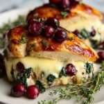 This Cranberry & Spinach Stuffed Chicken Breasts with Brie recipe is a delicious, elegant main course combining tender chicken breasts stuffed with creamy brie, fresh spinach, and sweet dried cranberries. Perfectly seared and then baked to juicy perfection, this gluten-free dish offers a delightful balance of flavors and textures, ideal for a special holiday meal or a comforting weeknight dinner.
