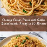 - Assemble and Serve: Add the cooked pasta to the skillet and toss thoroughly to coat the noodles evenly with the Caesar sauce. Add additional reserved pasta water as needed to achieve your desired saucy texture. Top the pasta with the golden toasted breadcrumbs, fresh chopped parsley, and extra Parmesan cheese if desired. Serve immediately for the best flavor and texture.