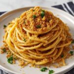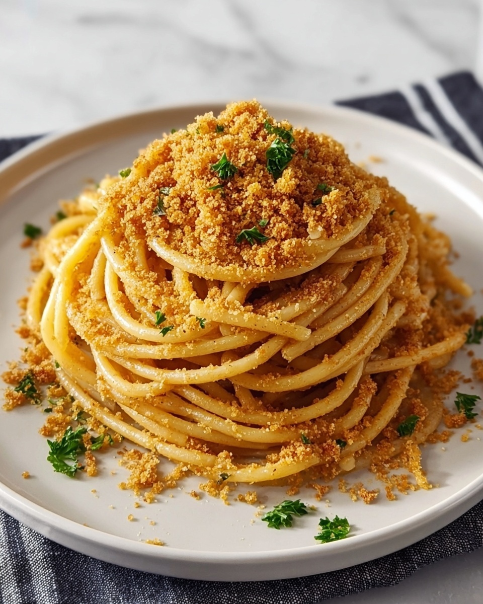 Add your drained pasta directly into the skillet with the sauce. Toss everything together so that the noodles are thoroughly coated, adding more pasta water if needed to reach your perfect creamy texture. Finally, top with the golden toasted breadcrumbs and a sprinkle of fresh parsley and extra Parmesan if desired. Serve immediately to enjoy contrast between creamy, tender pasta and crunchy topping.