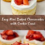 These delightful Miniature Baked Cheesecakes feature a buttery cookie crumb crust topped with a smooth and creamy lemon-infused cream cheese filling. Perfectly portioned for eight servings, these individual cheesecakes are baked to a light set, then chilled and garnished with fresh whipped cream and chopped strawberries for an elegant and delicious dessert bite.